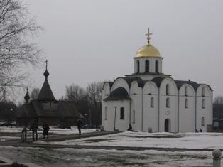 Далее наш путь лежал к площади Тысячелетия и Благовещенской церкви, расположенным на берегу Западной Двины. В небольшой деревянной часовенке рядом с церковью также ведутся молебны, а в открытой наземной колокольне возле стен церкви можно увидеть, какое мастерство требуется для, казалось бы, совершенно обычного колокольного перезвона, какой мы привыкли слышать перед началом службы в церкви.